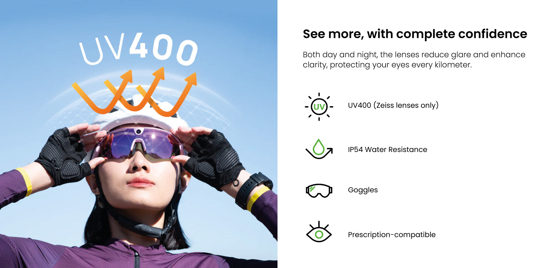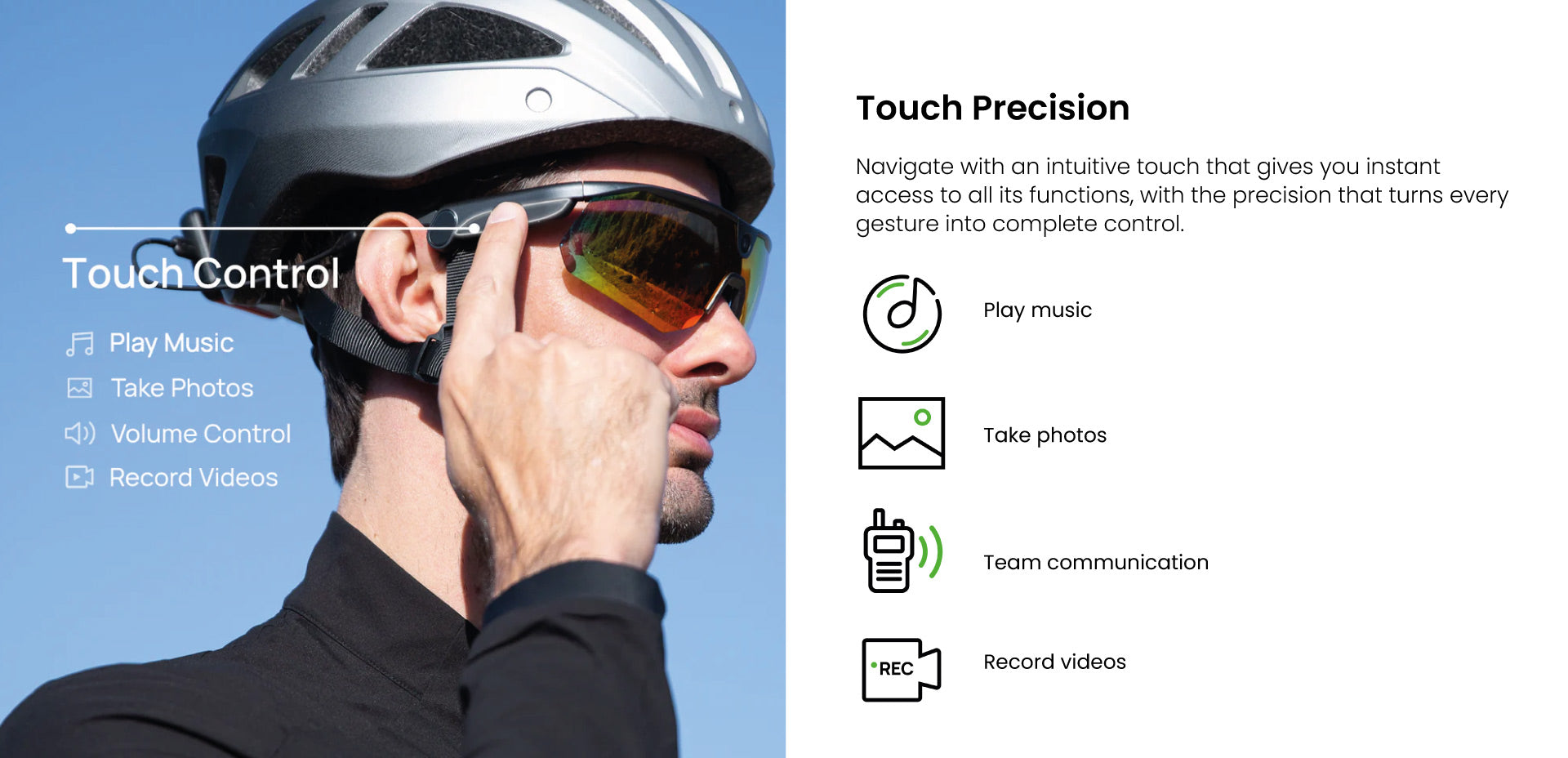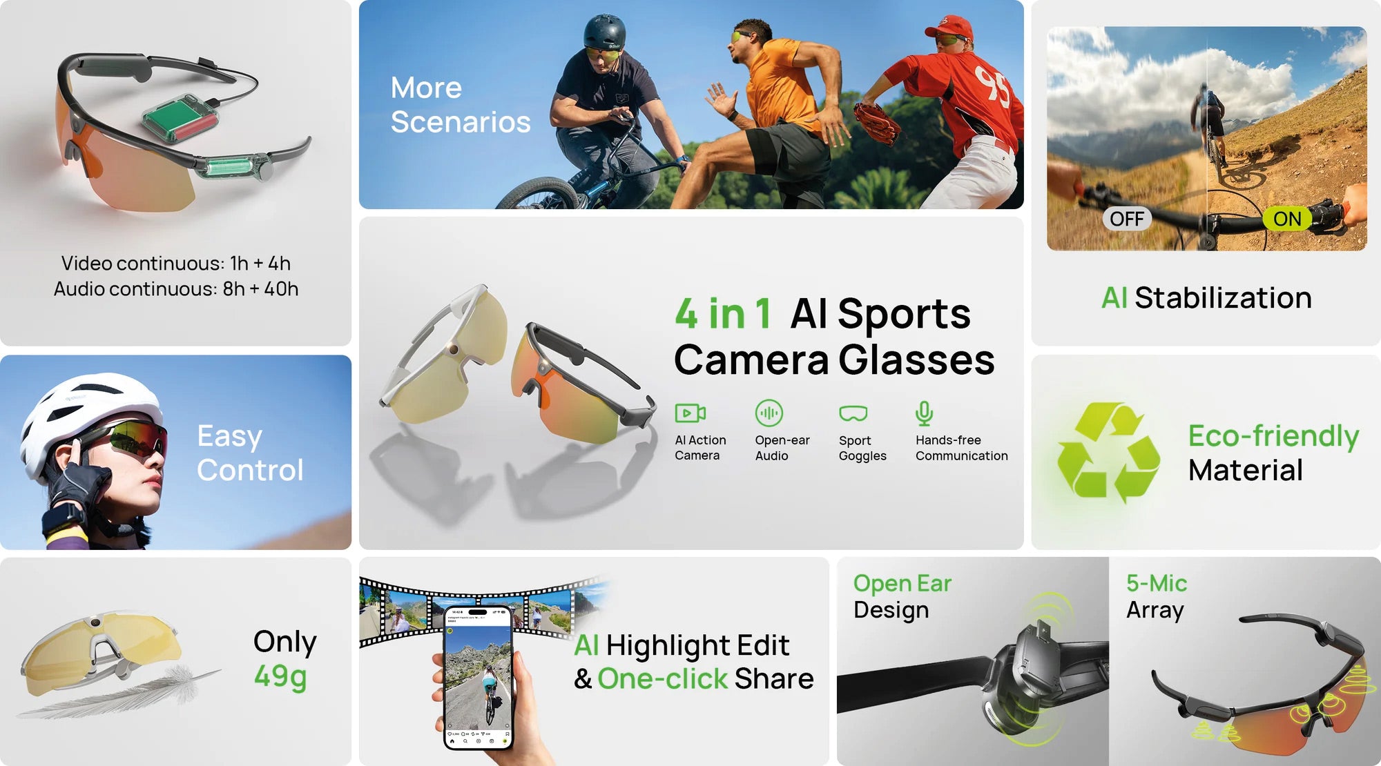 The first 4-in-1 sports glasses that combine an AI action camera, sports glasses, open driving audio and real-time communication in a single ultra-lightweight device.